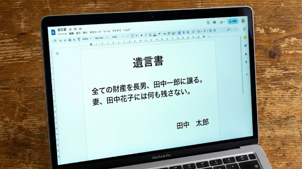 自筆証書遺言の本文は、必ず本人が全文を手書きしなければなりません。家族に代筆してもらったものや、パソコン・ワープロで作った本文は無効です。